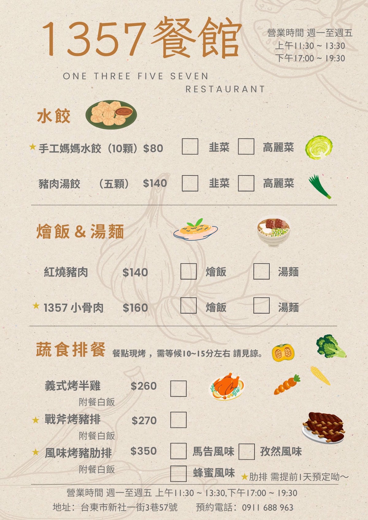 「1357 木子慢食」地點在新社一街3巷57號(e豆薏仁斜對面),地點鄰近馬蘭國小、新生國中、公東高工,2月剛開幕不久的咖啡廳「大人俱樂部」也在附近。