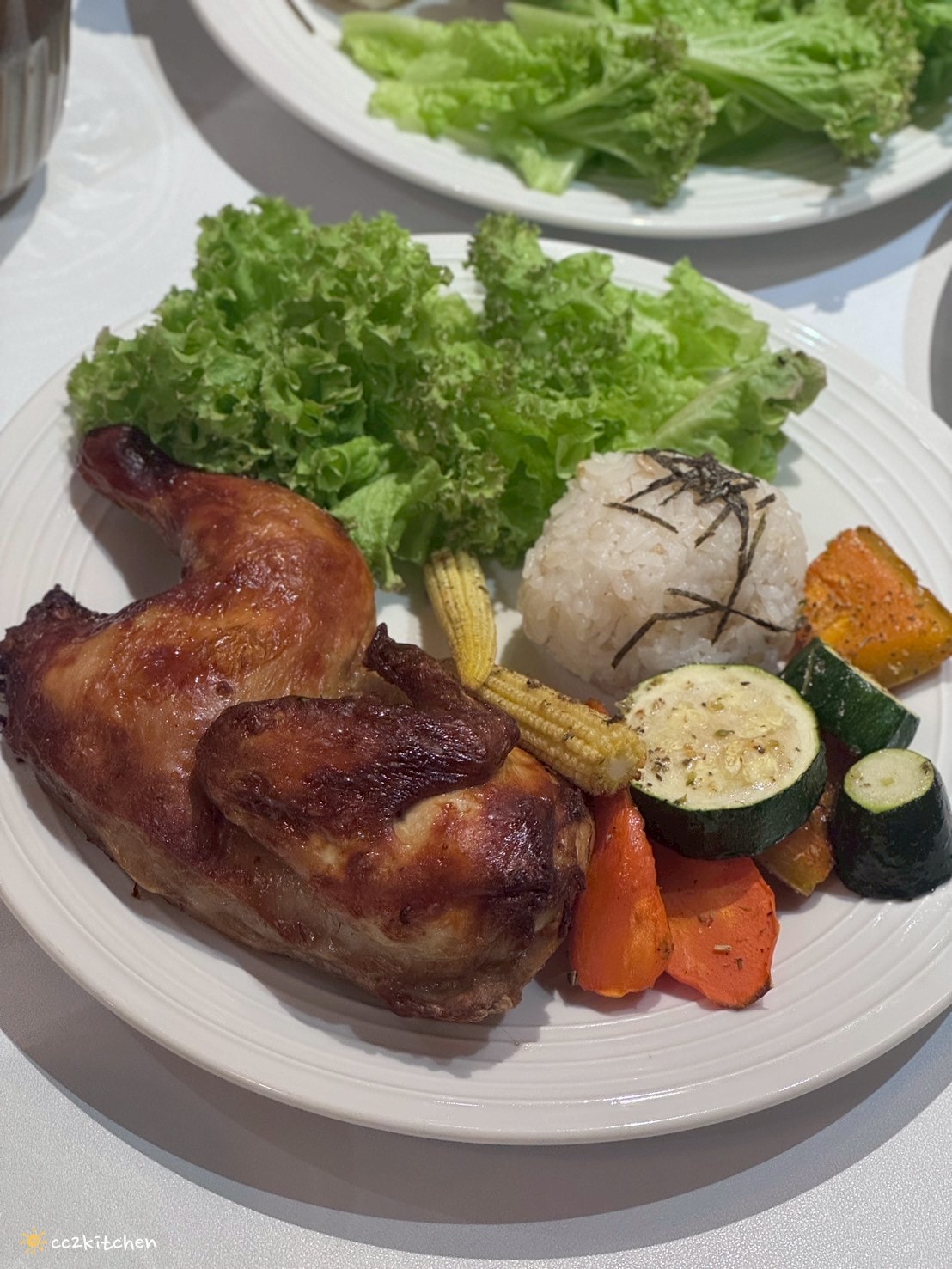 烤半雞肉質鮮嫩多汁,不乾不柴,火候掌握得恰到好處。搭配一旁簡單調味的烤時蔬,吃得到蔬菜原始的甜味與香氣,表現也相當不錯。