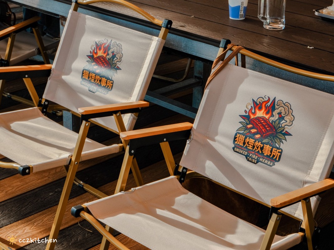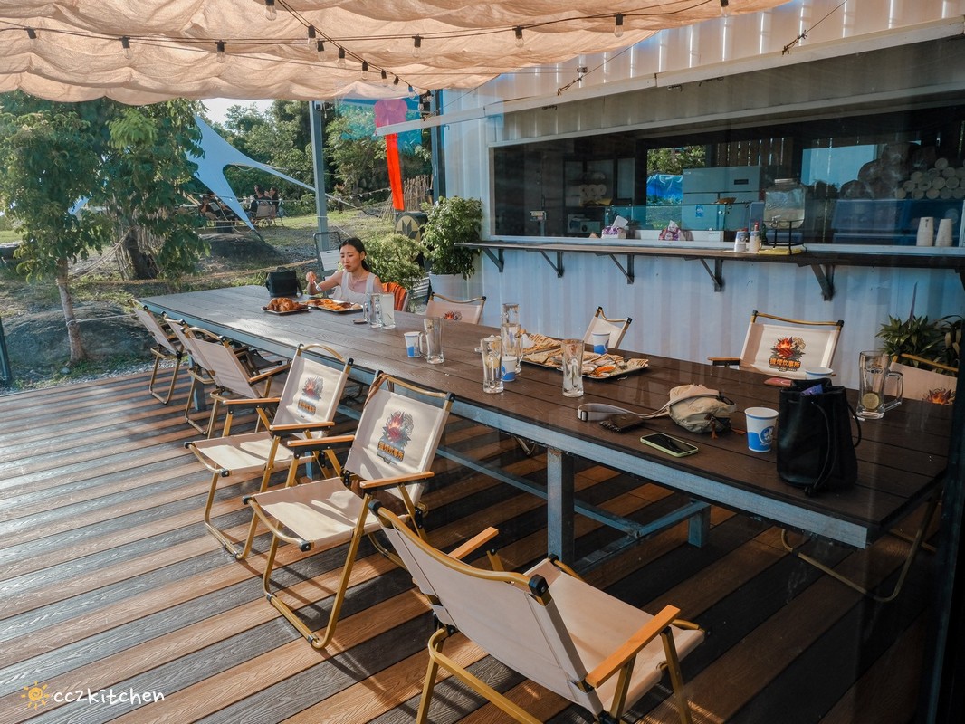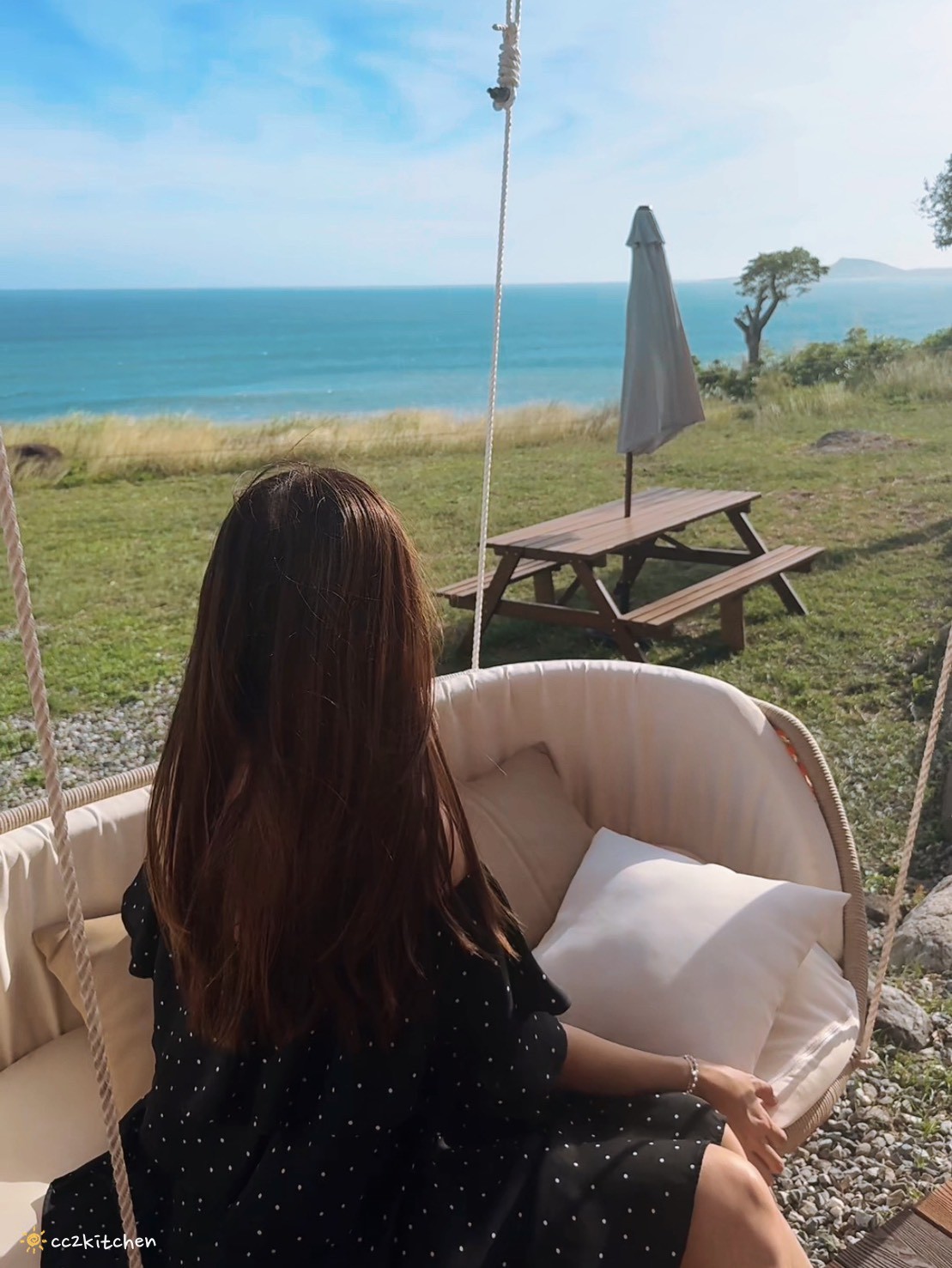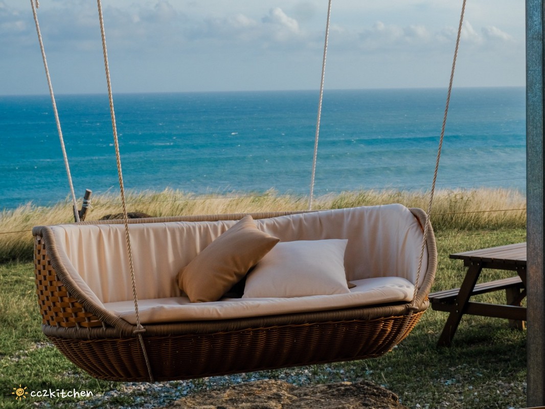 戶外座位區還特別設置了舒適的沙發鞦韆,是獵煙炊事所最受歡迎的角落。不少客人喜歡一邊手握調酒或啤酒,一邊在鞦韆上輕輕搖晃,放空看海,放鬆又愜意!