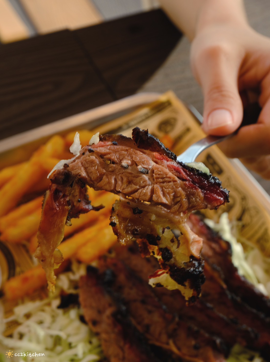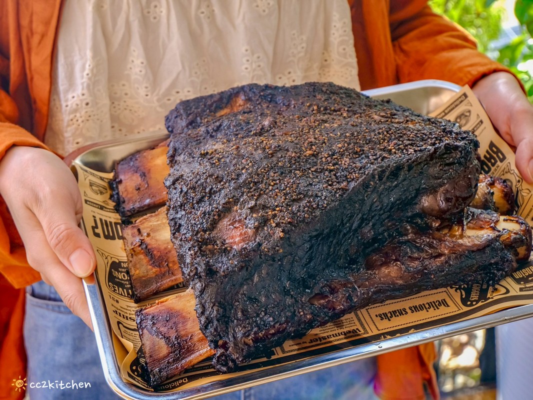 那份霸氣十足的牛肋骨靜靜地躺在烤盤上,雙手捧起就能感受到它的沉甸甸份量。表面覆著深黑的煙燻外皮,香氣撲鼻,光是看著就讓人食指大動!