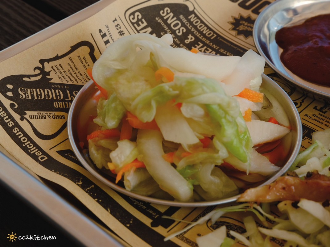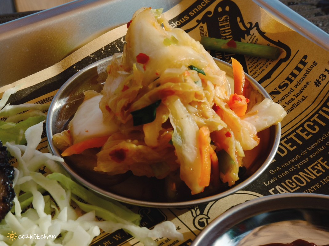 也可以搭配一旁的韓式泡菜一起食用,香辣的滋味提升了整體味道層次。