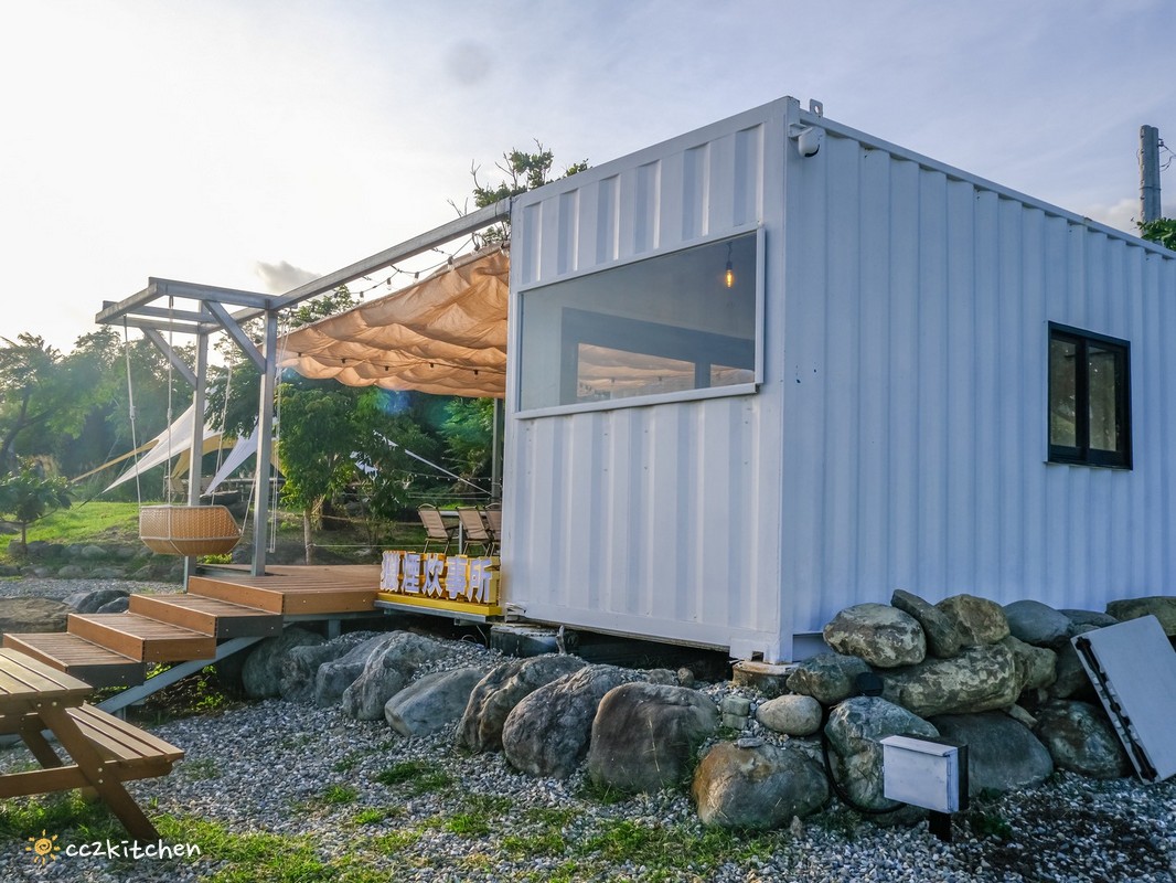 小小的餐酒館由白色貨櫃屋搭建而成,外觀簡約卻極具質感,呈現一種低調又自然的風格。