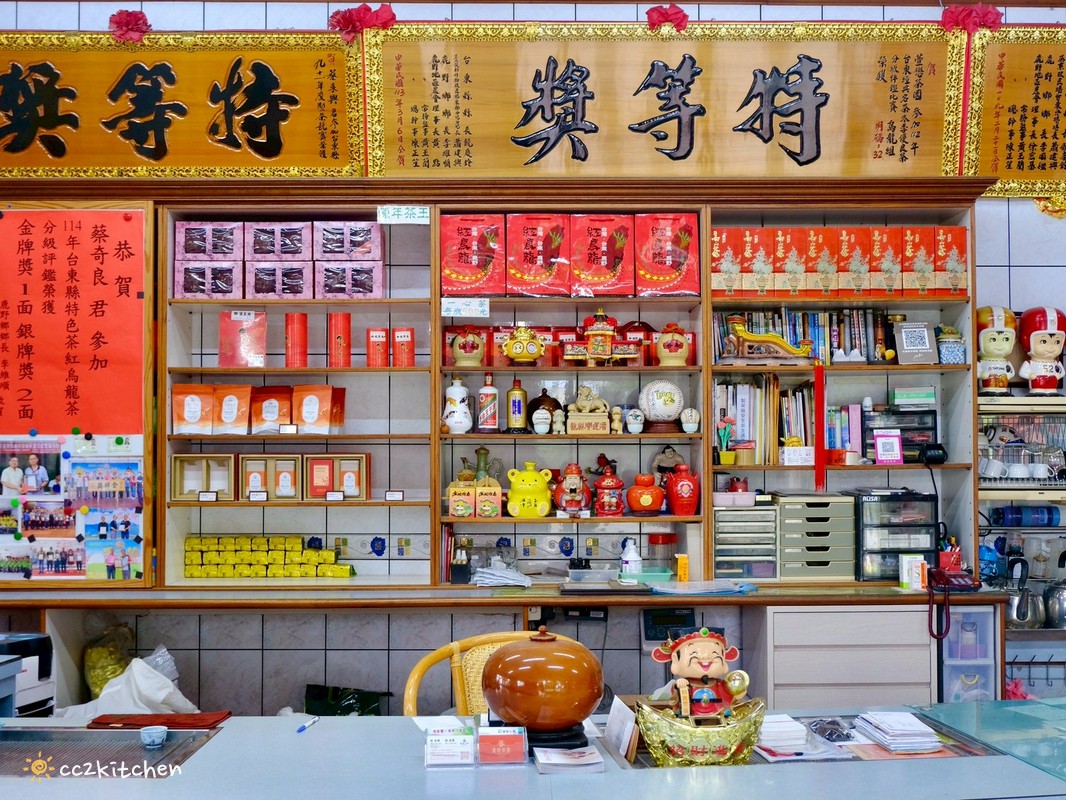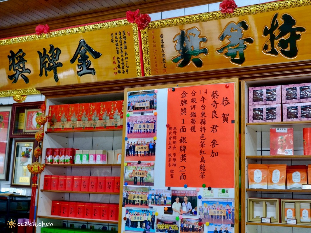 萱懋茶園地址位於臺東縣鹿野鄉永樂路239號。還沒走進去,就能看到外頭的玻璃門上貼滿了一張張紅榜;走進店裡抬頭一看,木頭匾額整齊懸掛,金牌獎、頭等獎……每一面都是對茶師手藝的讚賞。